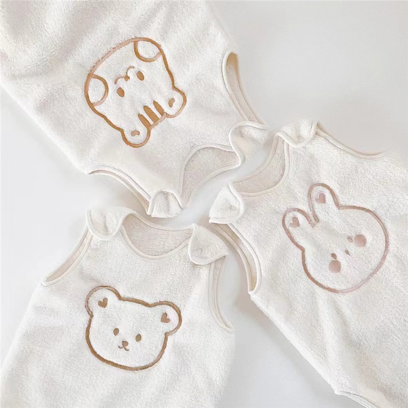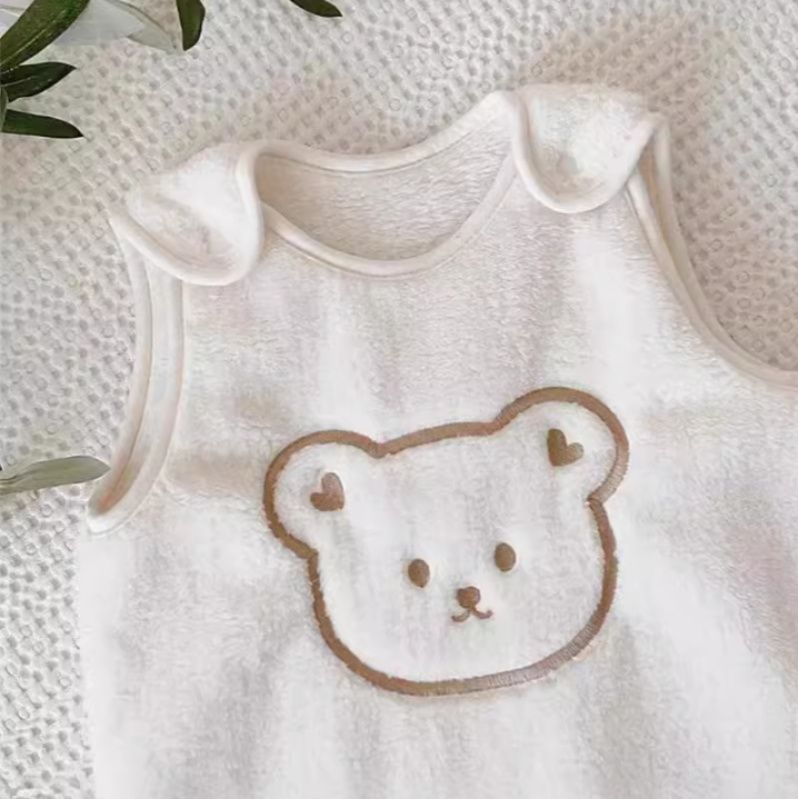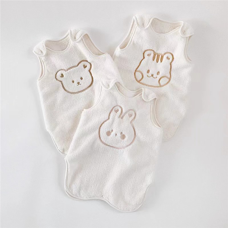 可愛らしい動物の刺繍が施された赤ちゃん用のスリーパーベストです。