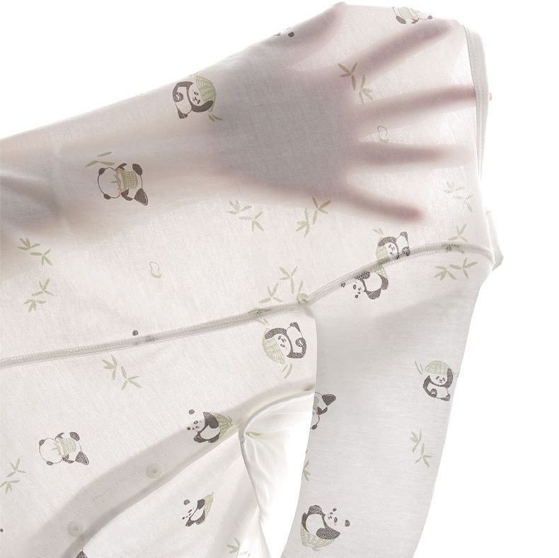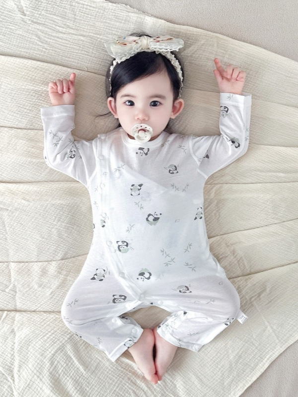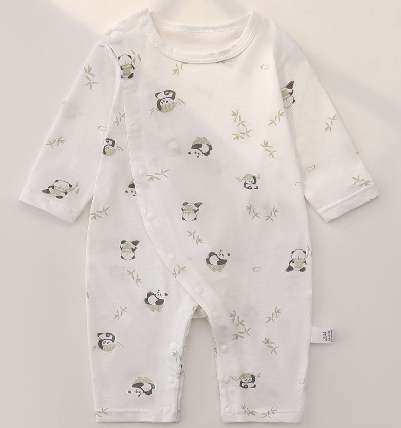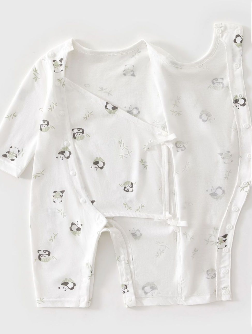 可愛らしいパンダと笹の葉が散りばめられた新生児向けスリーパーです。