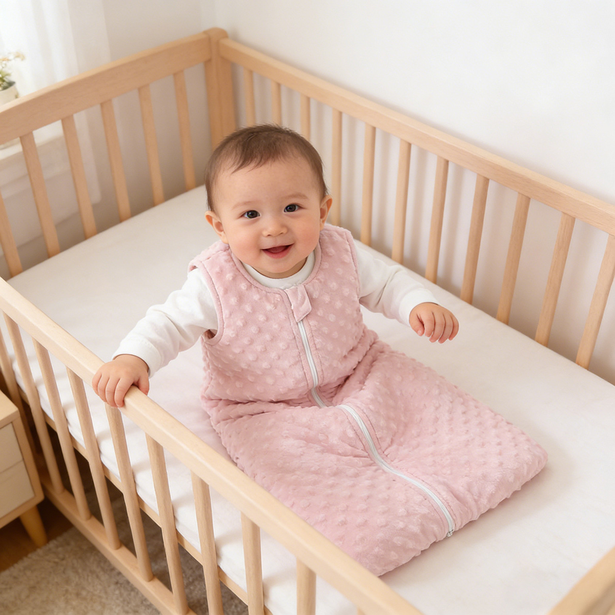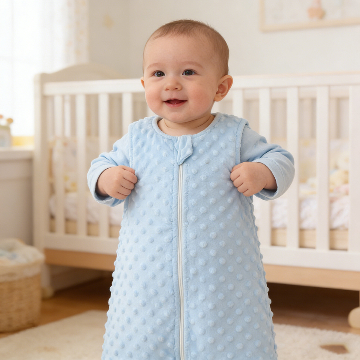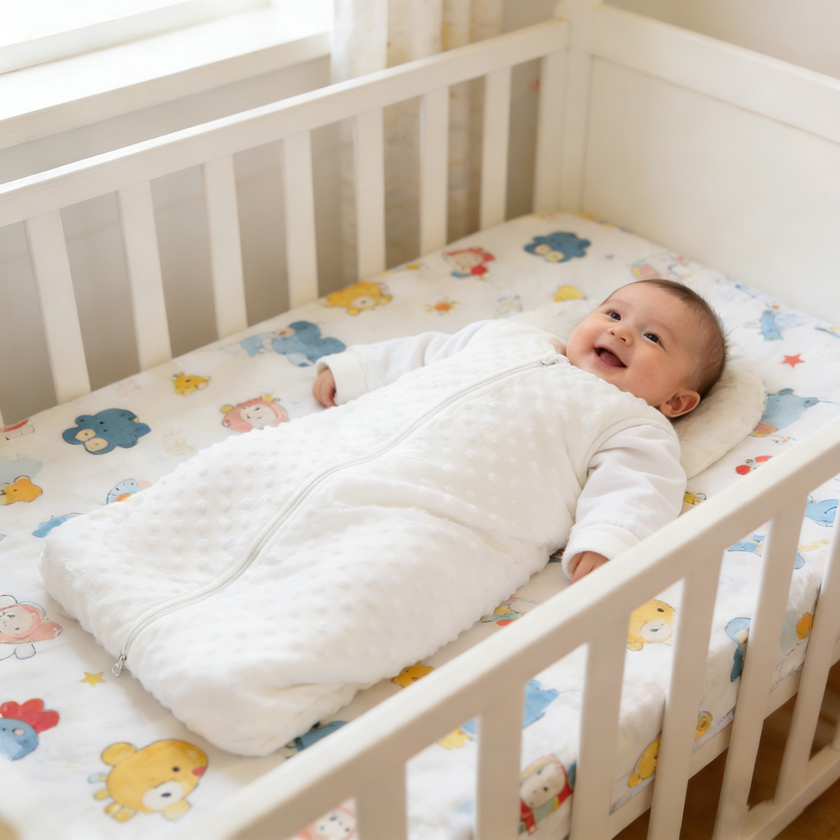 ふんわりとした中綿入りの生地が赤ちゃんを優しく包み込み、適度な保温性で一年中快適にお使いいただけます。