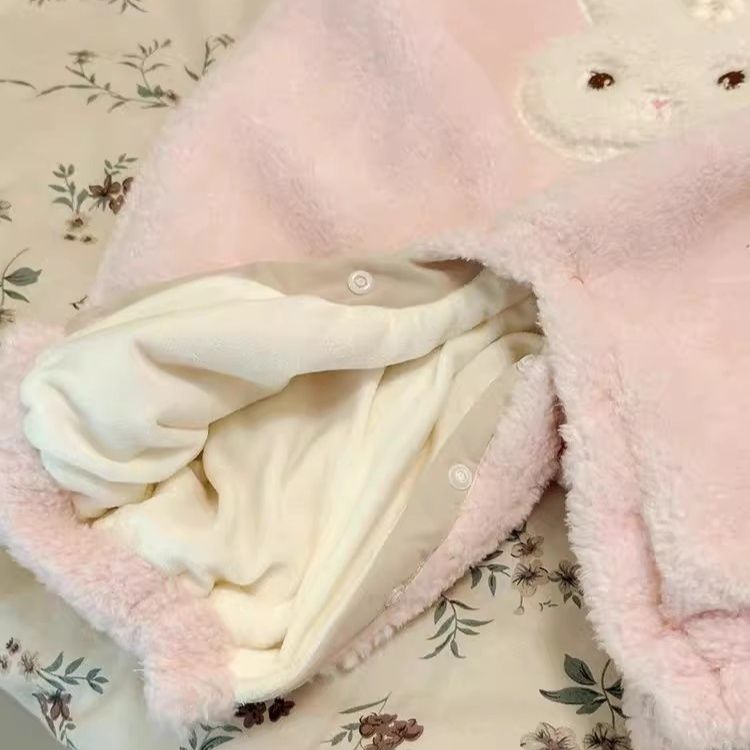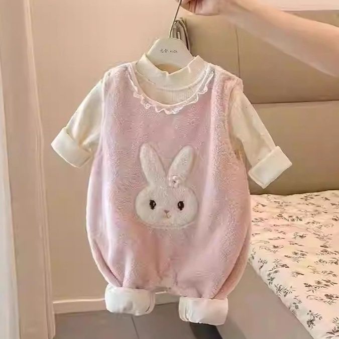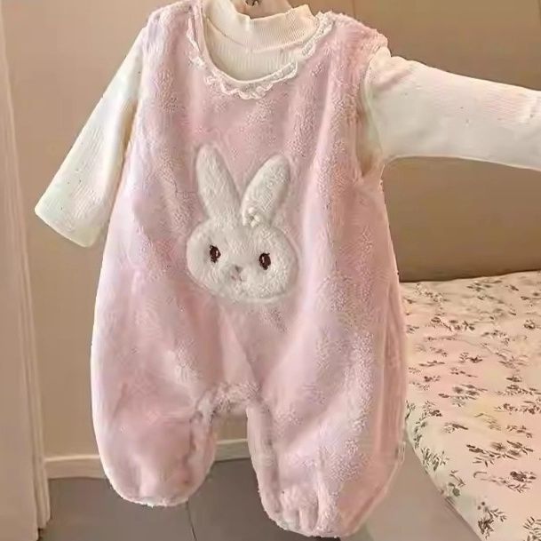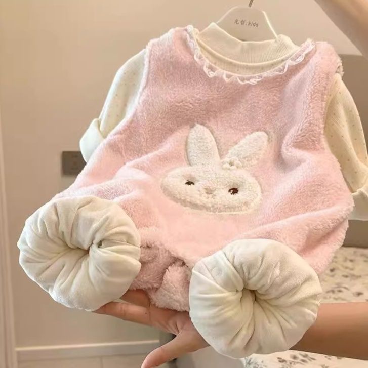 胸元に大きなうさぎの刺繍ワッペンがついた柔らかな素材のベストと、長袖の肌着がセットになっています。