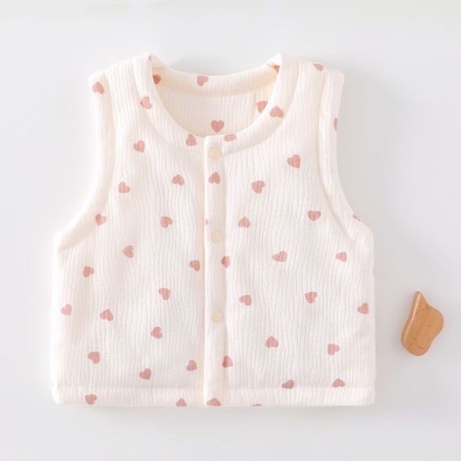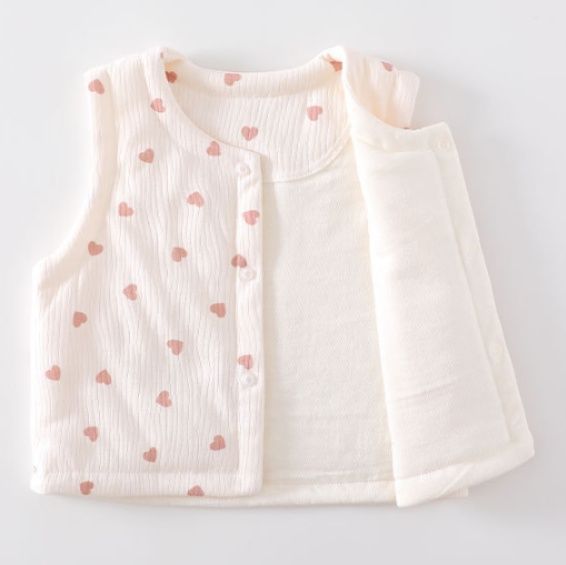 前開きスナップボタンで着脱も簡単、袖なしデザインなので季節の変わり目や室内での体温調節にも便利です。