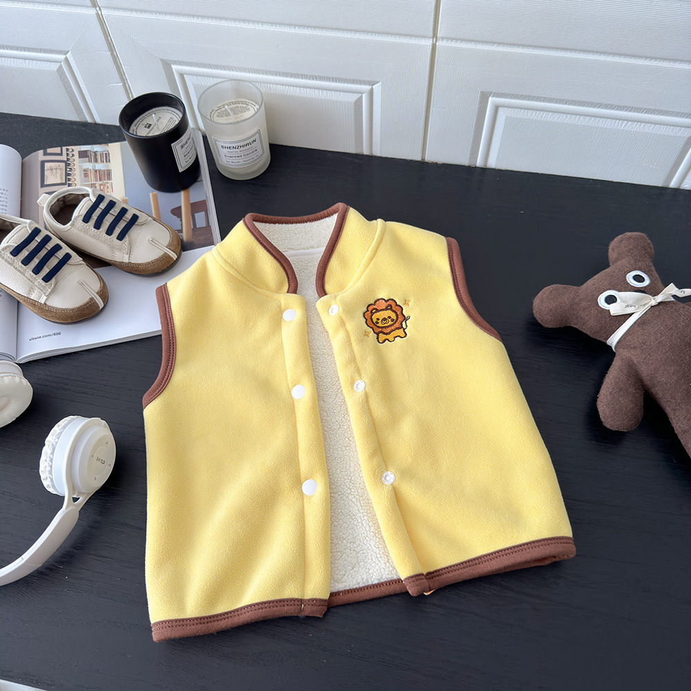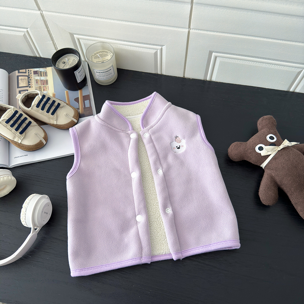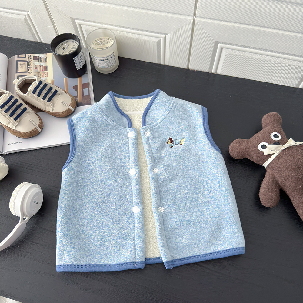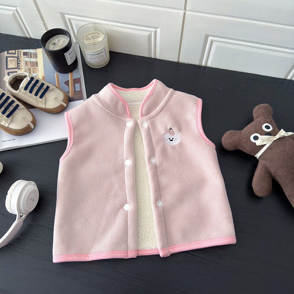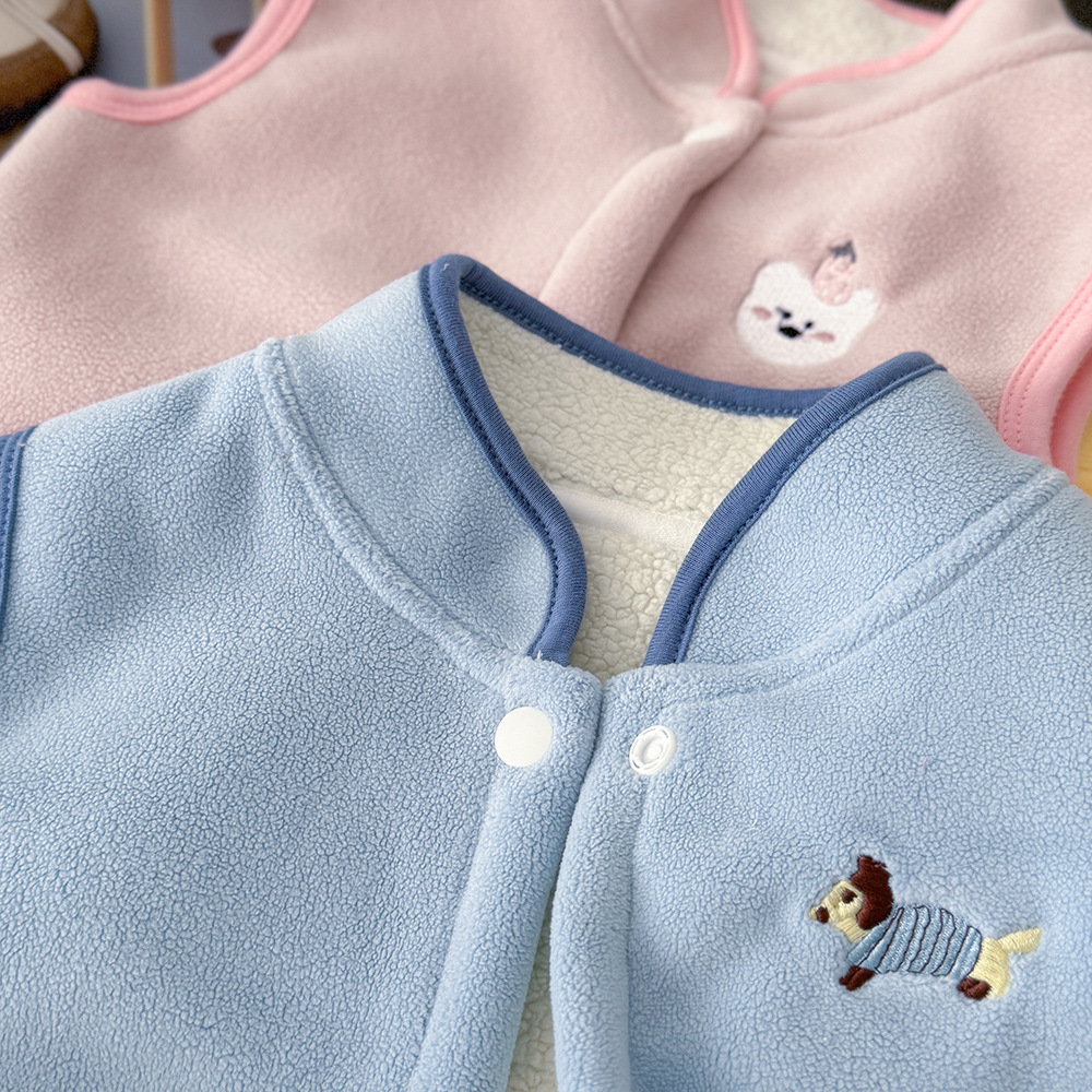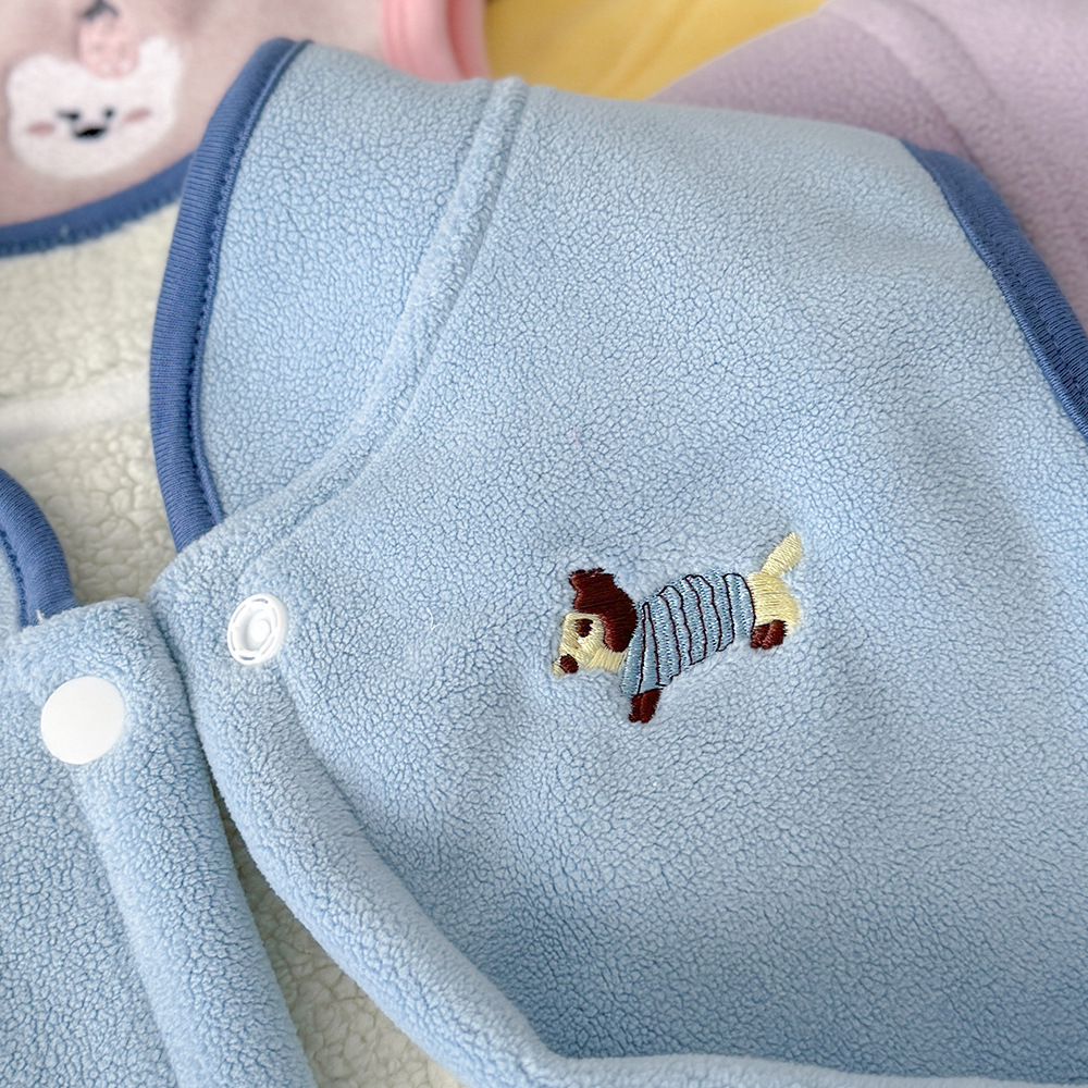 胸元には可愛らしい動物の刺繍がワンポイントで施され、前開きスナップボタンで着脱も簡単です。