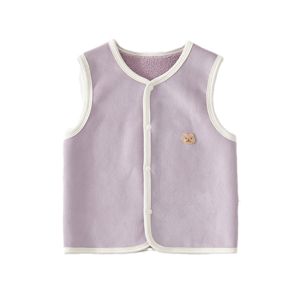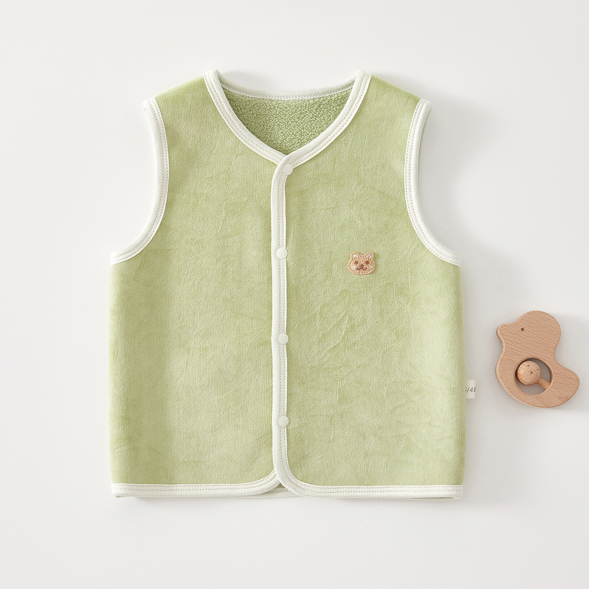胸元にはかわいらしいくまの刺繍がワンポイントで施され、赤ちゃんの愛らしさを引き立てます。