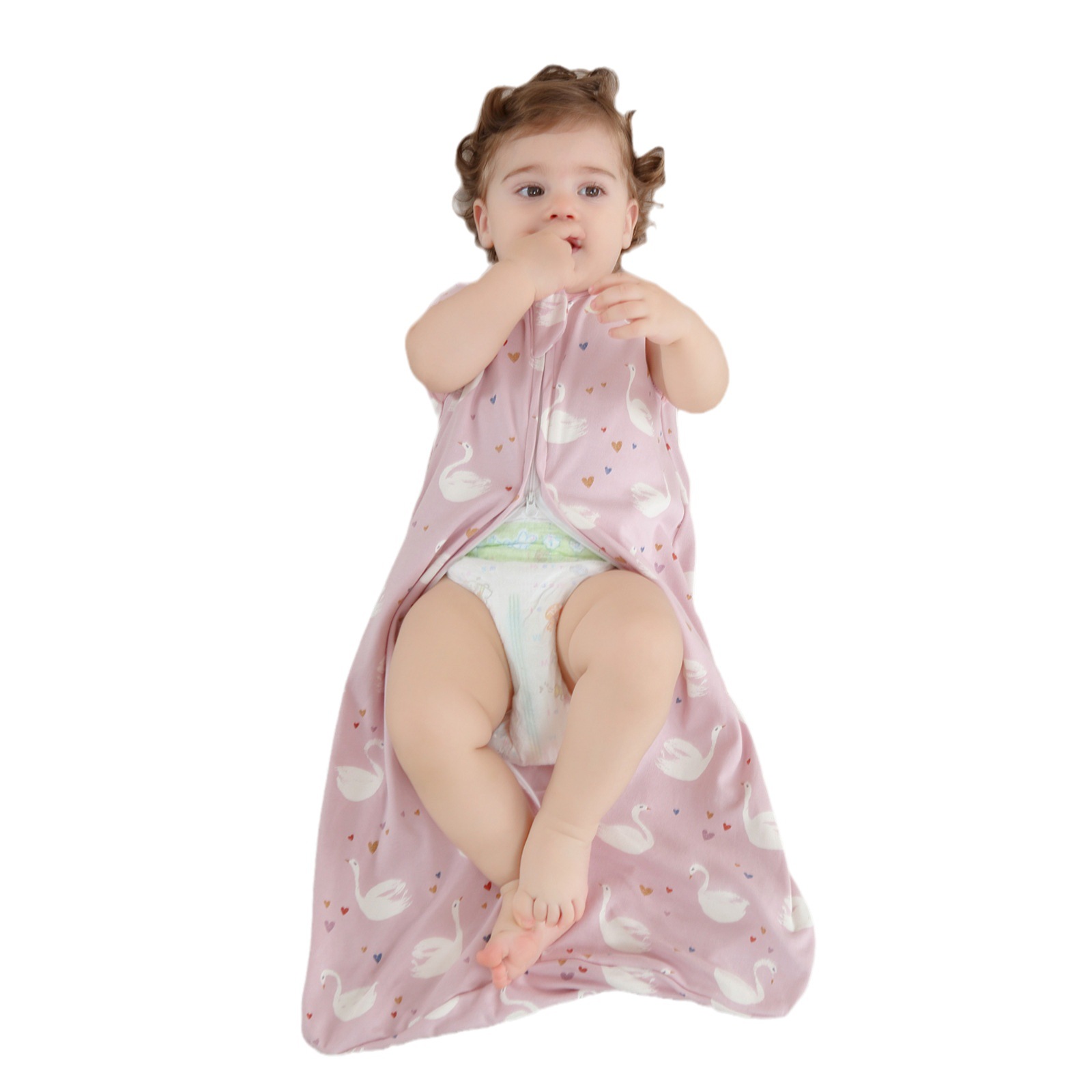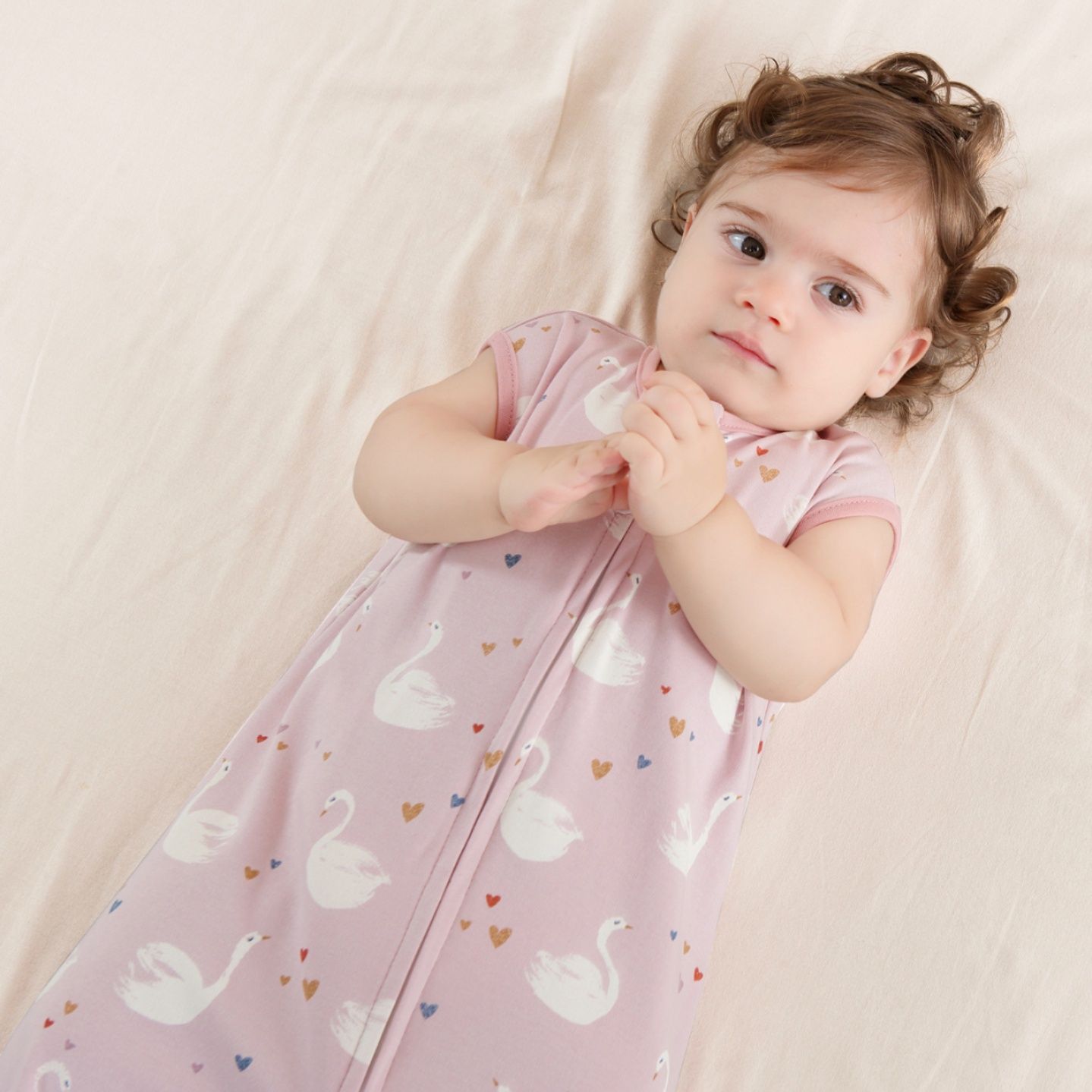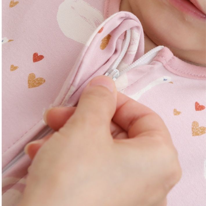 愛らしい白鳥と小さなハートがちりばめられた、赤ちゃんの眠りを優しく包むスリーパーです。