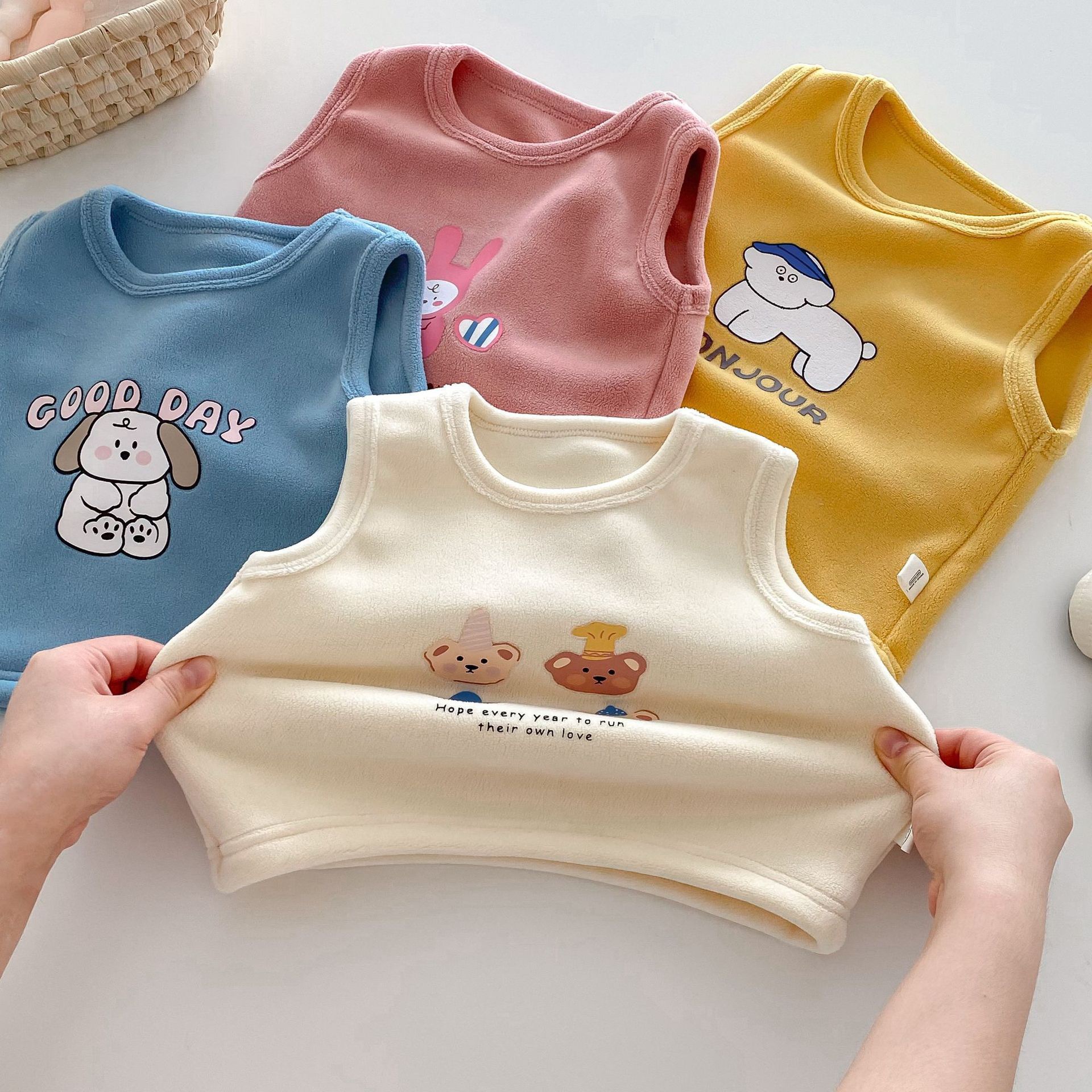 可愛らしい動物キャラクターがプリントされた子供用スリーパーベストです。