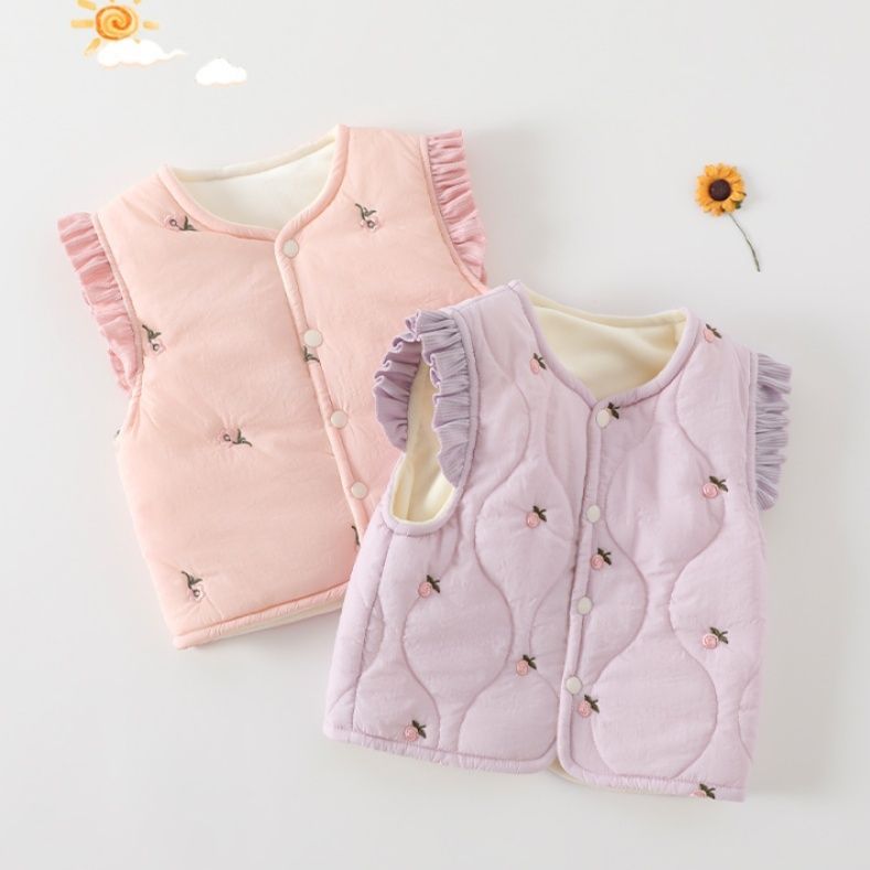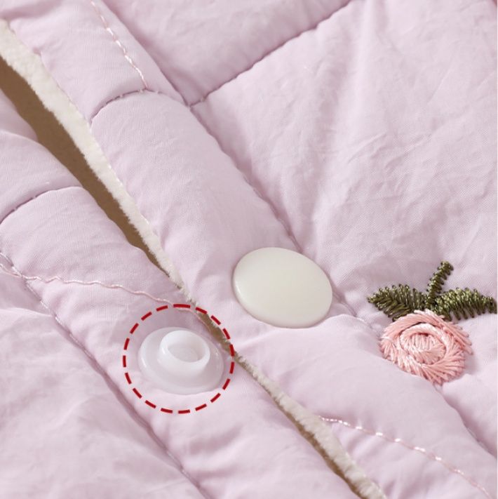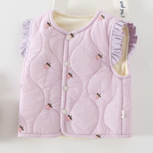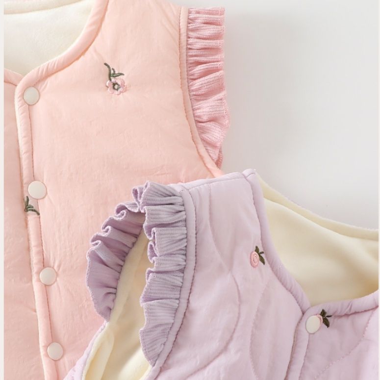 肩部分の可愛らしいフリルデザインと小花の刺繍が魅力的なベストタイプのスリーパーです。