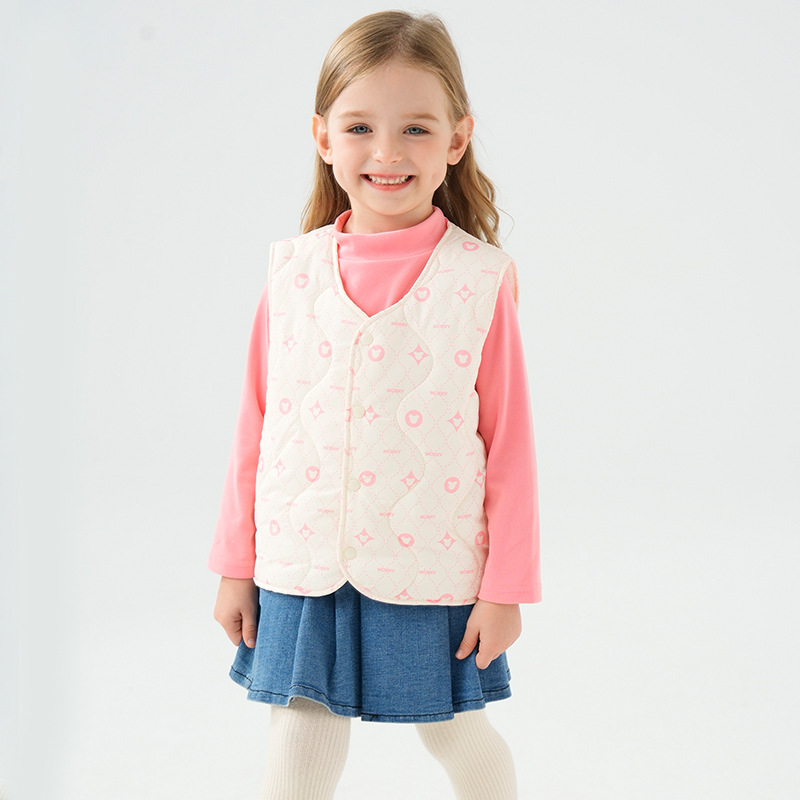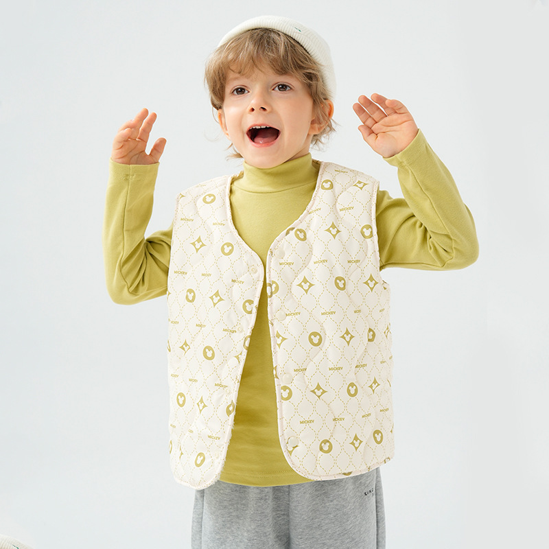 可愛らしい柄が全面に散りばめられた子供用のキルトベストです。